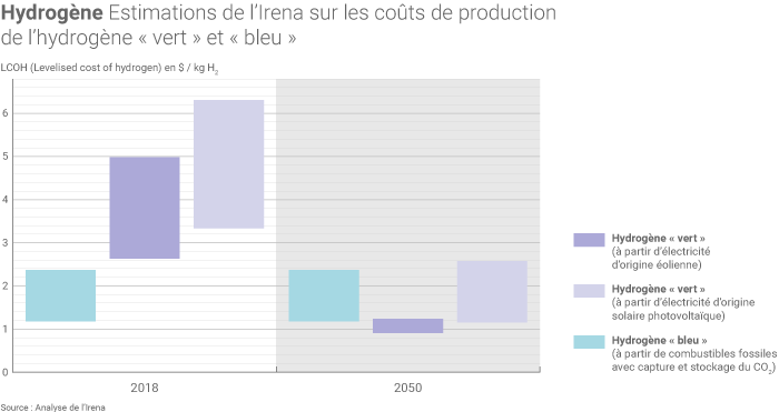 Selon l'Irena, l'hydrogène « vert » est « actuellement deux à trois fois plus coûteux que l'hydrogène bleu » (c'est à dire produit à partir d'énergies fossiles mais avec capture et stockage du CO2 émis), lui-même plus cher que le gris.