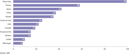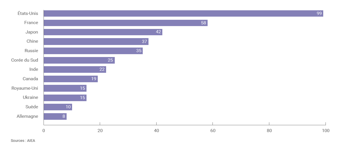 Les pays disposant les plus grands parcs nucléaires sont les États-Unis (94 réacteurs nucléaires), la France (57 réacteurs en incluant l'EPR de Flamanville) et la Chine (56 réacteurs et 28 autres en construction).