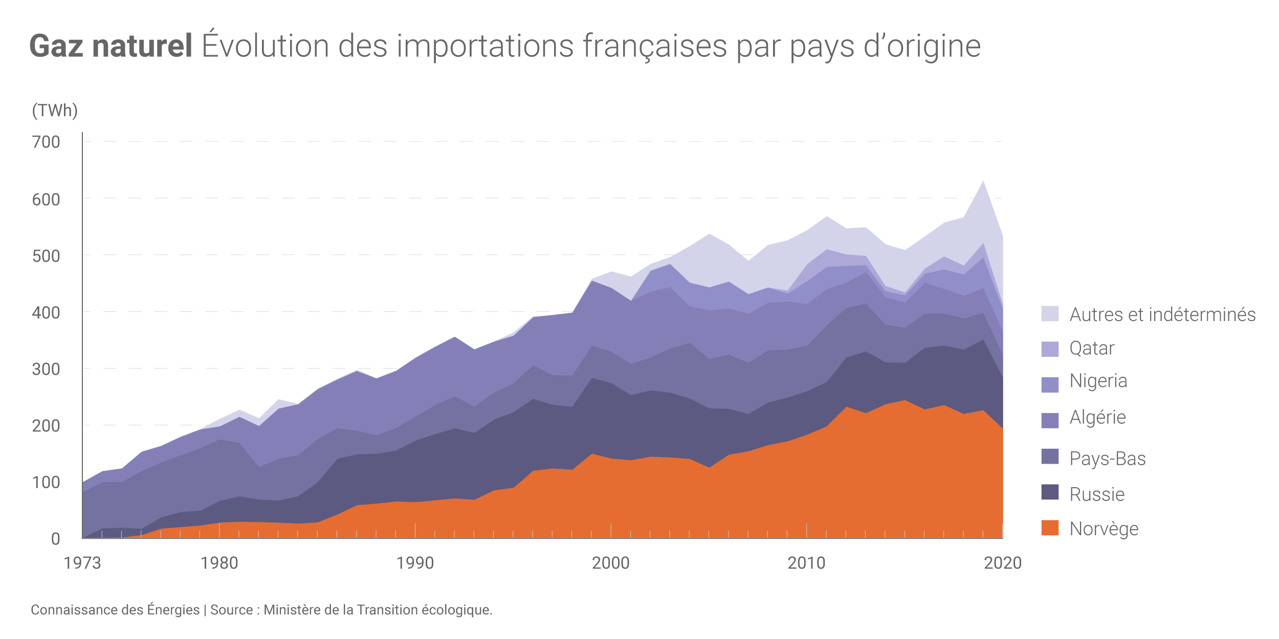 La catégorie « autres et indéterminés » englobe principalement les achats de gaz naturel sur les marchés du Nord-Ouest de l'Europe sur lesquels le lieu de production n'est pas connu avec précision. (©Connaissance des Énergies)