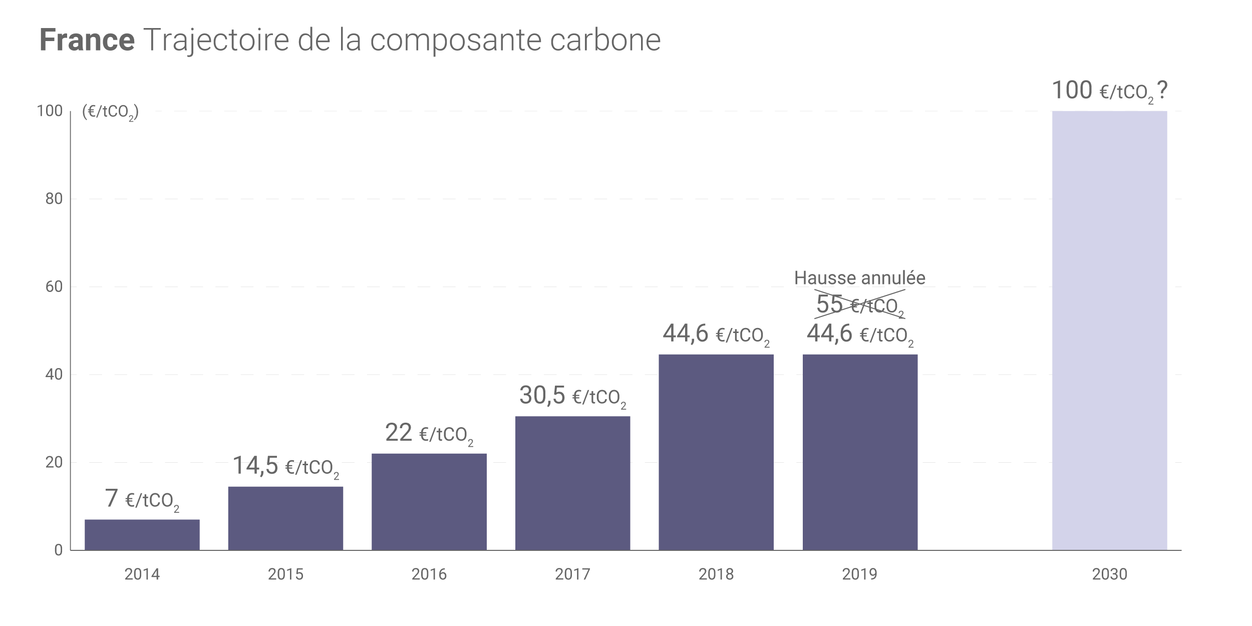 Depuis 2014, les accises incluent une « composante carbone » calculée en euros par tonne de CO2 émise lors de la combustion de carburants. En 2018, cette composante s'élevait à 44,6 € par tonne de CO2, ajoutant environ 12 centimes par litre de gazole et 10 centimes par litre d'essence. Bien que la loi de finances 2018 prévoyait une augmentation importante et progressive jusqu'en 2030, le processus d'augmentation a été interrompu après le mouvement des « gilets jaunes » par la loi de finances 2019.