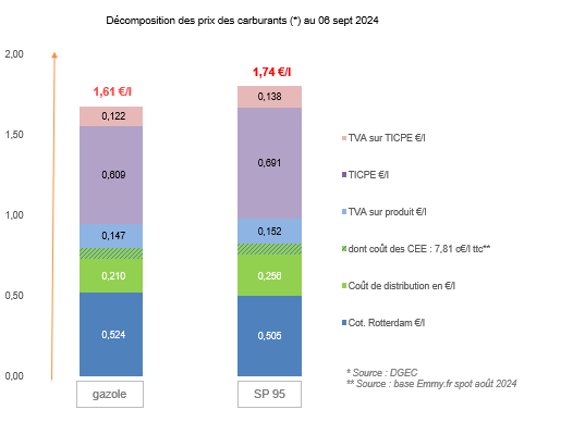 En 2024, les taux de l'accise s'élèvent à 59,40 centimes par litre pour le gazole et 68,29 centimes pour l'essence SP95-E5(1), hors majorations régionales.