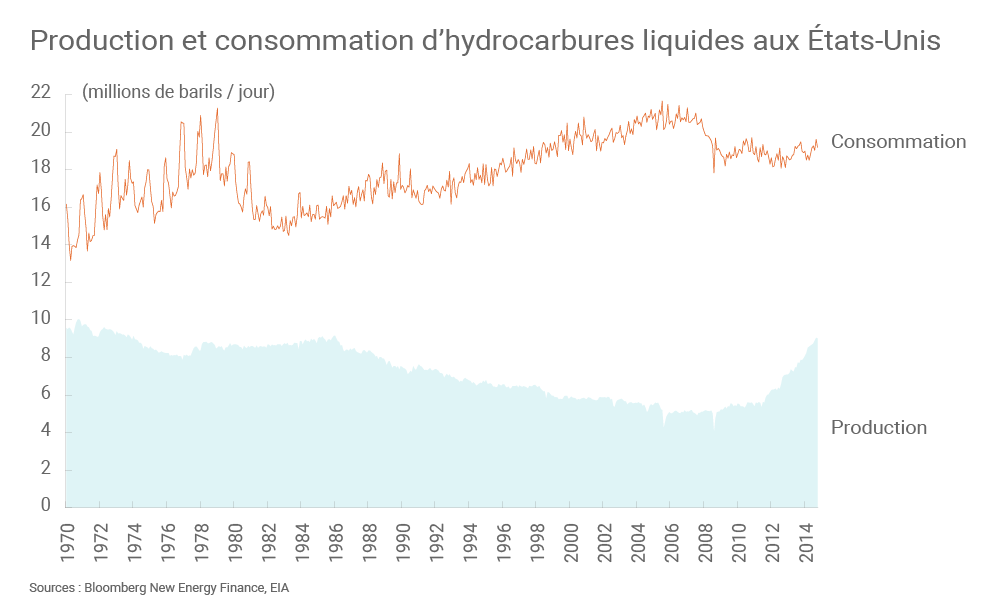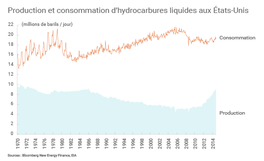 En 2014, la production américaine de pétrole brut a atteint près de 8,7 millions de barils par jour, soit environ 54% de la consommation nationale de brut (à partir duquel sont produits les produits pétroliers par raffinage). Le pays a ainsi dû importer près de 7,3 millions de barils de brut par jour en 2014. La production américaine de pétrole brut connaît certes une forte croissance : elle a augmenté de 70,6% entre 2006 et 2014 grâce à ses ressources non conventionnelles (« tight oil » incluant les pétroles de schiste).