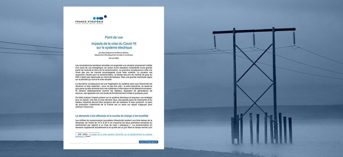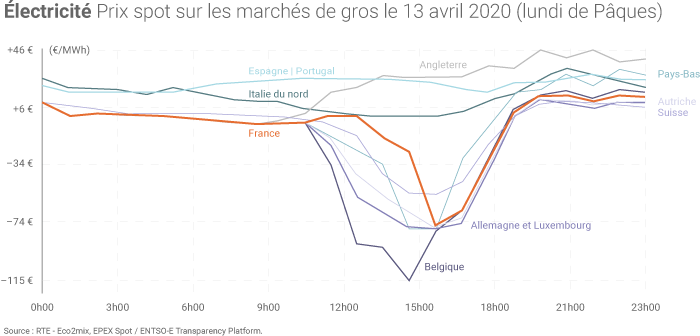 Avec la chute de la consommation, les prix de marché de l’électricité ont fortement baissé, « y compris pour les contrats à terme en 2021 et 2022, preuve que le marché anticipe une crise assez longue »(3). France Stratégie signale « des épisodes de prix négatifs particulièrement longs » sur les marchés de gros, notamment le 13 avril (lundi de Pâques) en raison d’« une production solaire trop importante pour être absorbée par la demande » et du maintien en service de centrales pilotables dont l'arrêt serait trop coûteux(4)