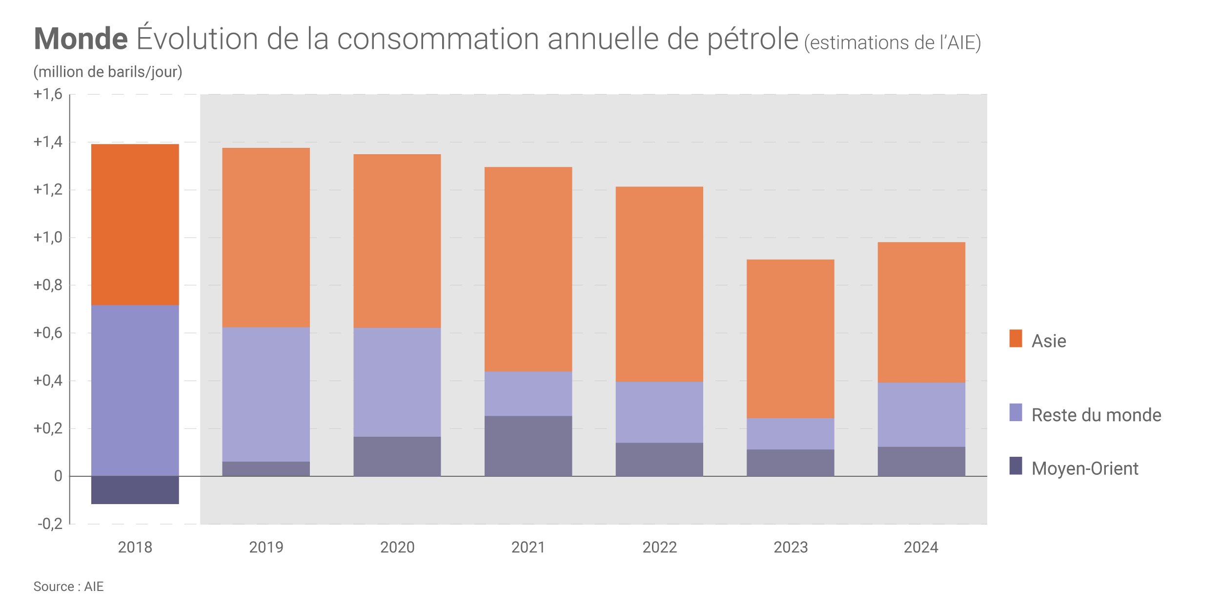 La croissance de la consommation mondiale de pétrole dans les 5 ans à venir viendra en grande majorité de l’Asie (la Chine et l’Inde comptant à elles seules pour 44% de cette hausse attendue) selon l’AIE, tandis que la consommation européenne est appelée à diminuer - très légèrement - sur cette période (- 0,1 Mb/j entre 2018 et 2024).