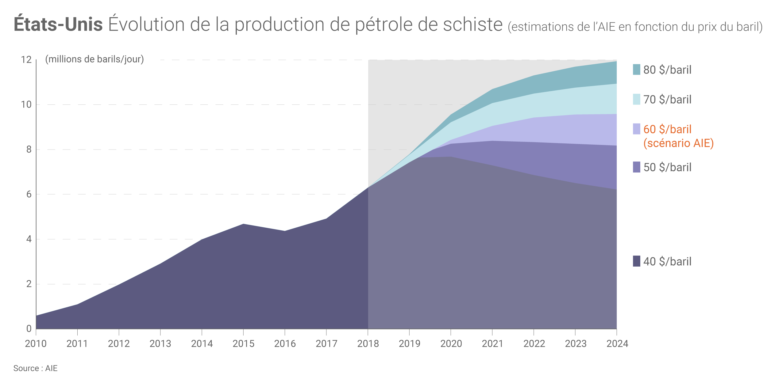 En 2018, la production moyenne de « pétrole » (incluant le brut, les liquides de gaz naturel et autres hydrocarbures liquides) a avoisiné 99,7 millions de barils par jour (Mb/j) au niveau mondial selon les dernières données de l'AIE. D'après les prévisions de l’Agence, cette production pourrait encore augmenter de 5,7 Mb/j d’ici à 2024, principalement « grâce à l'incroyable force de l’industrie (américaine) du schiste ».