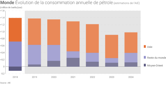 L’Asie - en particulier la Chine et l’Inde - va jouer un rôle central dans la hausse de la consommation mondiale de pétrole d’ici à 2024, indique l'AIE. (©Connaissance des Énergies, d’après AIE)