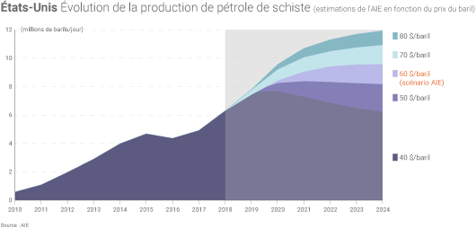 Les États-Unis, désormais premier producteur mondial de pétrole brut, joue un rôle croissant sur les marchés pétroliers, en particulier du fait « des caractéristiques particulières des huiles de schiste qui offrent la capacité de s’adapter rapidement aux évolutions du prix du pétrole ». L’importance de la production américaine d’huiles de schiste (donc hors hydrocarbures « conventionnels ») fait l’objet de prévisions variées pour 2019 : elle pourrait être comprise entre 9,1 Mb/j et 11,1 Mb/j en fonction de l’activité de forage et de la productivité des puits selon IFPEN(2) (contre 7,3 Mb/j en moyenne pour ces seules huiles de schiste sur l’année 2018).
