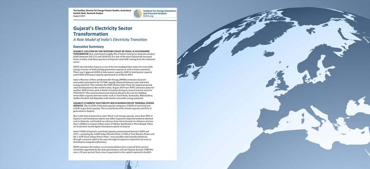 Dans le rapport en anglais ci-après publié fin août 2019, l'Institute for Energy Economics and Financial Analysis (IEEFA) effectue « une évaluation du secteur électrique du Gujarat » en montrant son « énorme potentiel pour (engager) une transition vers un système à bas coût et à faibles émissions reposant sur les énergies renouvelables ». À fin mars 2019, le Gujarat disposait de 2 GW de capacités solaires installées et de 6 GW de capacités éoliennes, ce qui en faisait déjà l'« un des cinq principaux États indiens (sur 29) pour les énergies renouvelables » en matière de puissance installée.