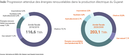 Selon les estimations de l'IEEFA, la production d'électricité du Gujarat devra augmenter de 74% entre les années fiscales 2018/2019 (116,6 TWh) et 2029/2030 (203,1 TWh) pour satisfaire la hausse de la demande. En 2029/2030, les énergies renouvelables (hors hydroélectricité) pourraient devenir la première source d'électricité de cet État (48,1% du mix électrique), devant le charbon (33,8%), le gaz naturel (7,1%) et le nucléaire (6,8%). Cela impliquerait d'installer 46,5 GW(2) de capacités renouvelables additionnelles d'ici à 2029/2030, soit de l'ordre de 4 à 5 GW par an(3).