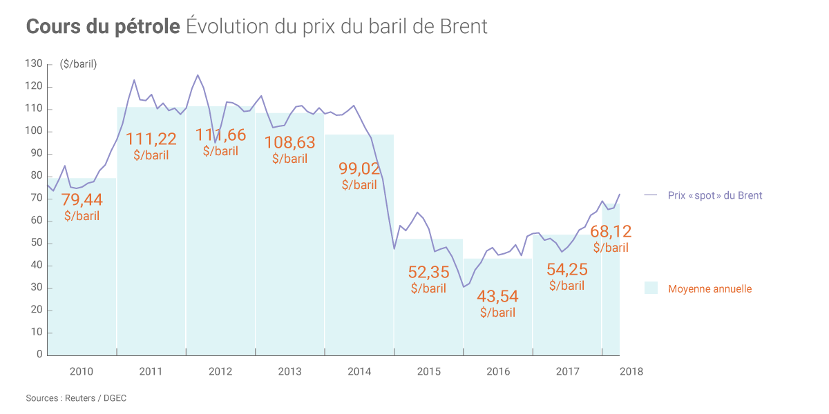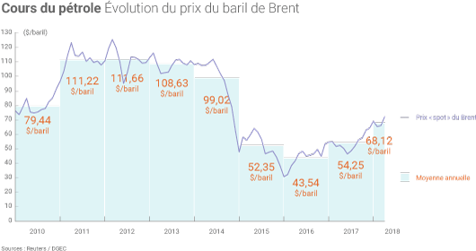 En avril 2018, le cours moyen du baril de Brent a dépassé 75 $, alors qu’il était encore inférieur à 50 $ en juillet 2015. Cette remontée des cours est en grande partie due à l’accord des pays membres de l’OPEP et de dix autres producteurs de pétrole (dont la Russie) sur le plafonnement de leur production pétrolière, ainsi qu’aux inquiétudes sur l’offre pétrolière (liées aux tensions géopolitiques).