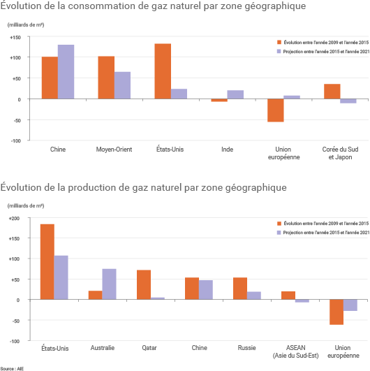 L’AIE signale néanmoins que le gaz naturel est la seule énergie fossile dont la part ne recule pas dans le mix énergétique mondial (23,8% de la consommation primaire en 2015). Cette part devrait continuer à augmenter dans les 5 années à venir. D’ici à 2021, la hausse de la consommation de gaz naturel devrait principalement provenir de la Chine qui voit dans cette énergie un moyen de diversifier son mix au détriment du charbon et de contribuer à l’amélioration de la qualité de l’air.