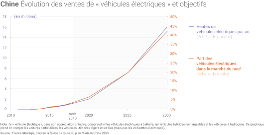 Disposant d’un marché intérieur gigantesque, le gouvernement chinois a fixé des objectifs particulièrement ambitieux pour les prochaines années : plus de 2 millions de véhicules électriques vendus sur son territoire en 2020 (en incluant bus et VUL), plus de 7 millions en 2025 et environ 16 millions en 2030 (soit près de 40% du marché des véhicules neufs à cet horizon selon les prévisions chinoises).