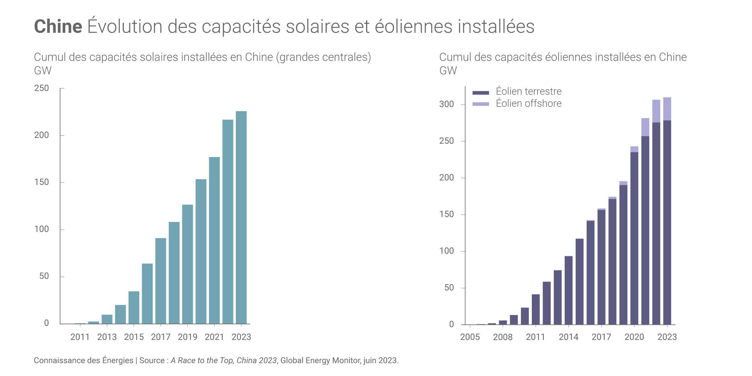 Or, le Global Energy Moinitor indique que les projets annoncés à fin mars 2023 s'élèvent à environ 379 GW de centrales solaires supplémentaires et environ 371 GW de nouvelles installations éoliennes. Ces données - « en hausse constante » - concernent en majorité des projets qui devraient aboutir dans le cadre du 14e plan quinquennal de la Chine, soit d'ici à fin 2025. L'objectif fixé par le gouvernement central chinois à l'horizon 2030 pourrait ainsi être « surpassé » avec 5 ans d'avance.