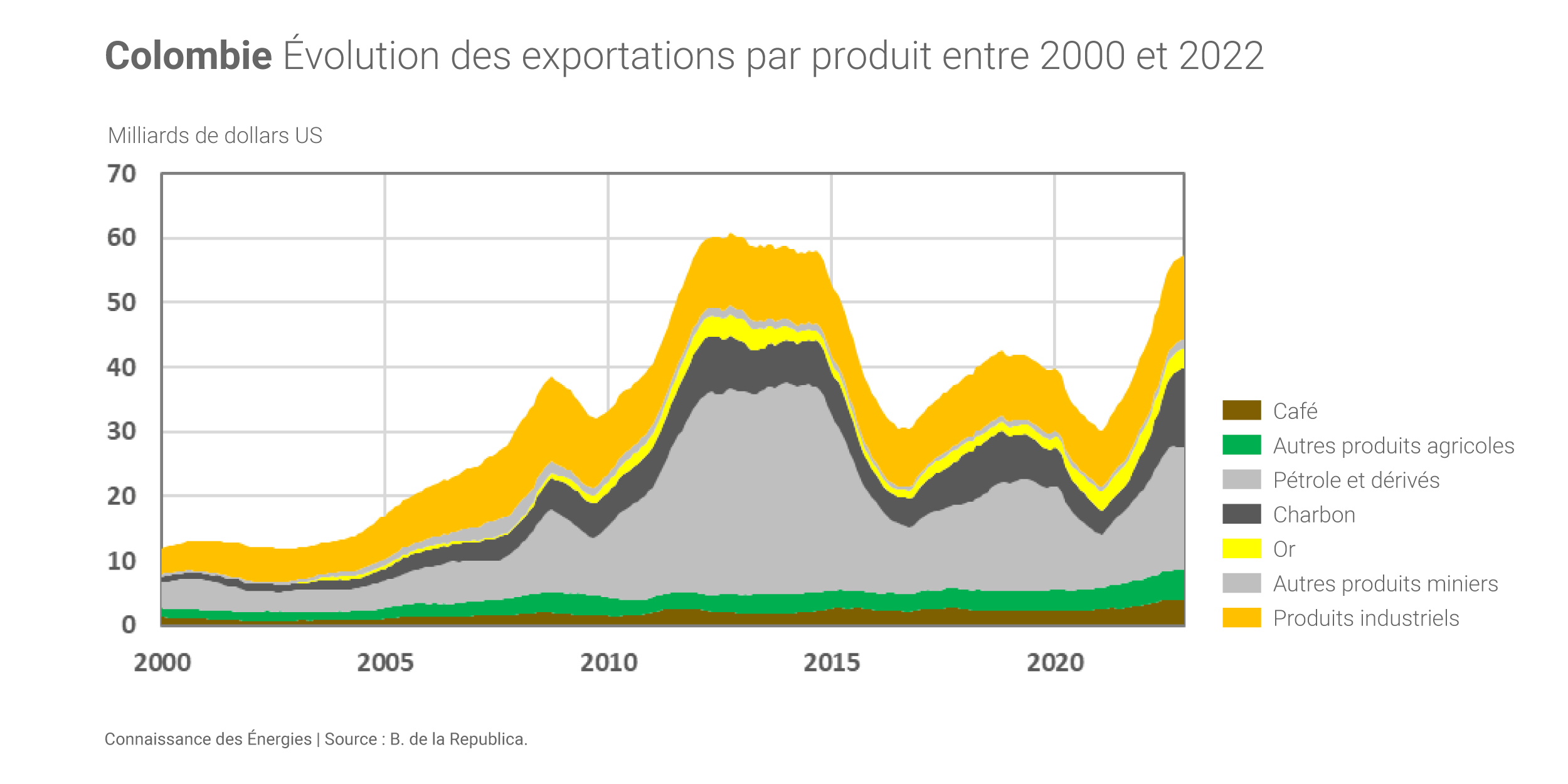 La Colombie exporte la majorité du pétrole et surtout du charbon qu'elle produit (le pays est le 5e exportateur mondial de charbon, ses livraisons étant principalement destinées aux États-Unis). Les exportations colombiennes de pétrole et de charbon ont compté en moyenne pour « 54% des exportations de marchandises sur les dix dernières années » du pays (en valeur).