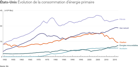 Ce déclin du « King Coal » s’explique principalement par la concurrence du gaz naturel dans le secteur électrique. Près de 93% du charbon consommé aux États-Unis entre 2007 et 2018 a en effet servi à produire de l’électricité. La compétitivité du gaz naturel, dont les prix sont restés à un niveau relativement bas depuis la croissance de la production domestique de gaz de schiste en 2007, est l’une des principales explications à la fermeture des centrales à charbon américaines selon l’EIA.