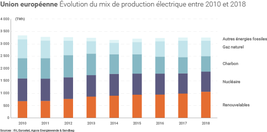 Entre 2010 et 2016, les émissions de CO2 par kWh produit dans l'Union européenne n'ont baissé que de 15%. Marc-Antoine Eyl-Mazegga et Carole Mathieu indiquent que « l'expansion des ENR ne s'est pas faite au détriment des centrales thermiques, et en particulier des centrales à charbon ». (©Connaissance des Énergies, d'après Ifri)