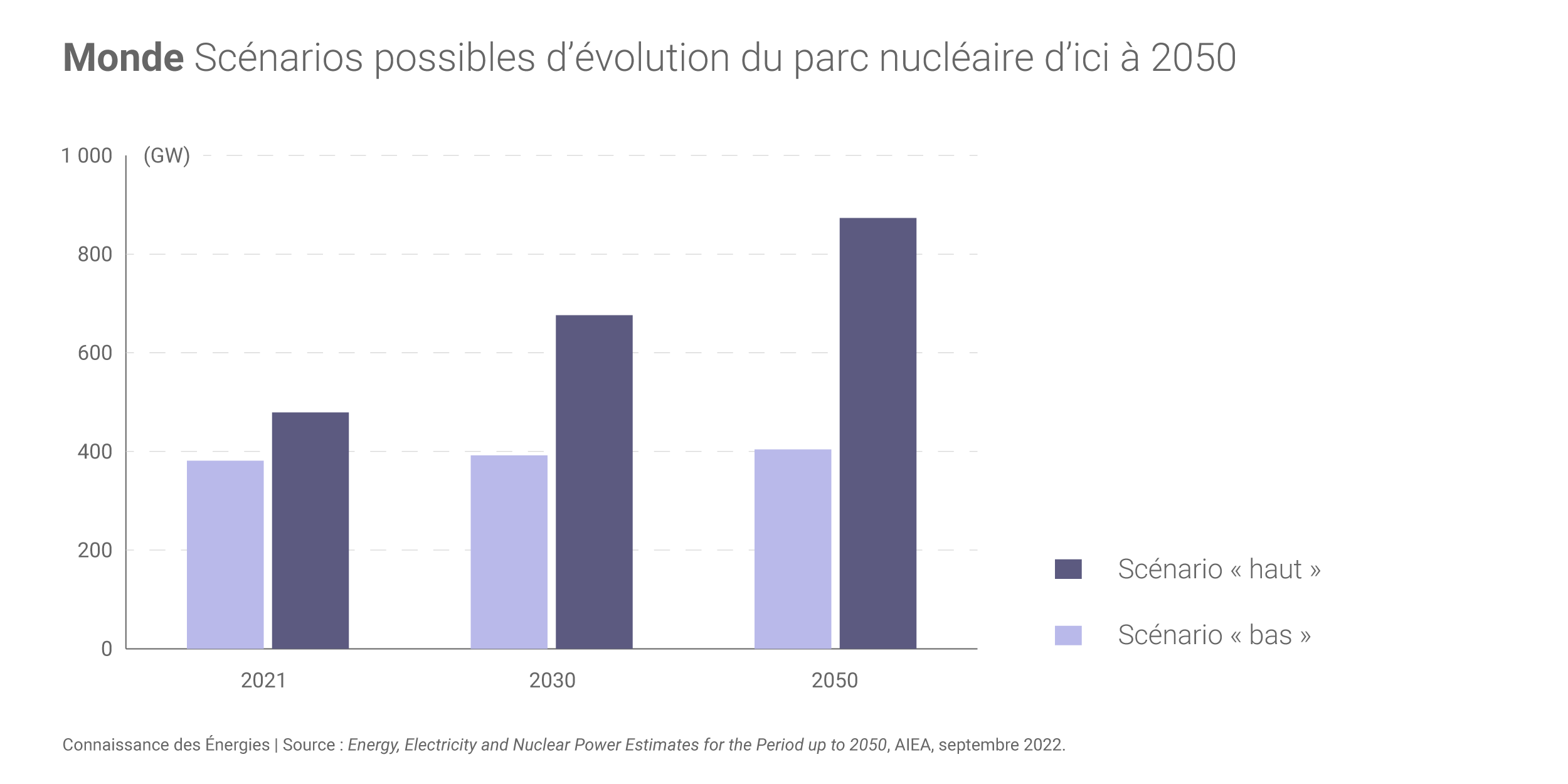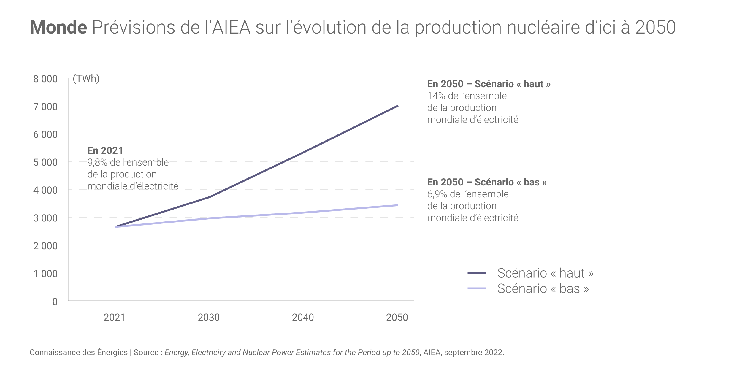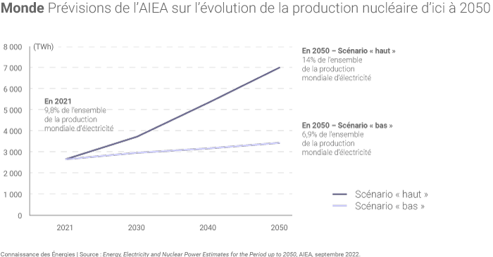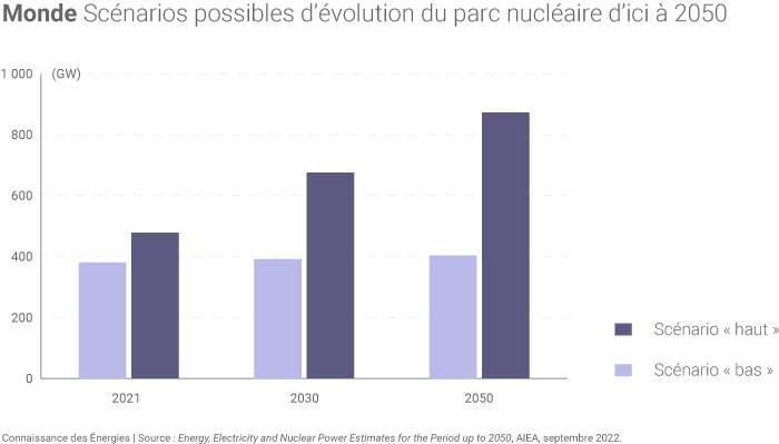 Dans le scénario « bas » de l’AIEA, la puissance du parc nucléaire mondial pourrait, par rapport au niveau de fin 2021, légèrement décliner d’ici à 2030 (- 2%) et augmenter à nouveau d’ici à 2050 (+ 3,5%). Au milieu du XXIe siècle, le nucléaire pourrait alors compter pour 6,9% de la production mondiale d’électricité selon ce scénario (avec une production annuelle de 3 435 TWh, soit une hausse de près de 30% par rapport au niveau de 2021).