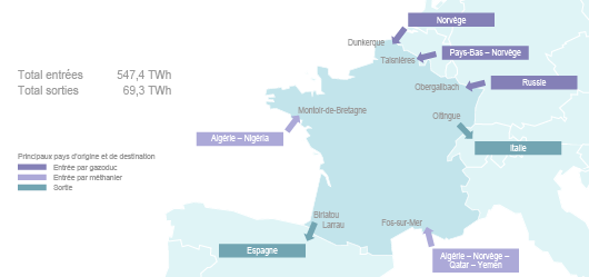 La France constitue un lieu de transit pour le gaz naturel entre le Nord et le Sud de l’Europe. Sur les cinq principaux points d’entrée du gaz naturel en France, quatre sont situés dans la partie nord du pays :