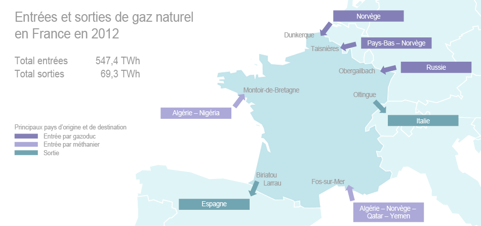 Ces sorties constituent au total 69,3 TWh, soit 12,7% des entrées initiales de gaz naturel en France. En 2012, les sorties vers l’Espagne ont augmenté de moitié tandis que celles vers la Suisse ont diminué d’un tiers.