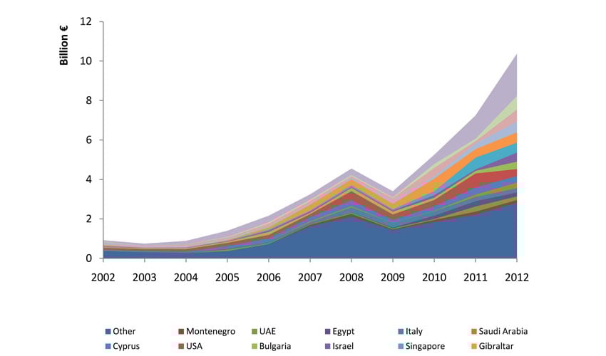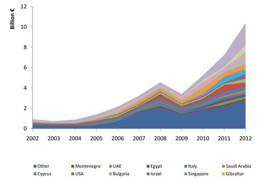 Il faut par ailleurs remarquer que la Grèce exporte une part importante des produits pétroliers provenant de ses 4 raffineries. Les exportations de ces produits ont ainsi compté pour près de 37,5% des exportations totales de la Grèce en valeur en 2012 (10,3 milliards d’euros) et contribué à réduire le déficit commercial du pays. Précisons que la très grande majorité de ces exportations transite vers des pays méditerranéens n’appartenant pas à l’Union européenne.