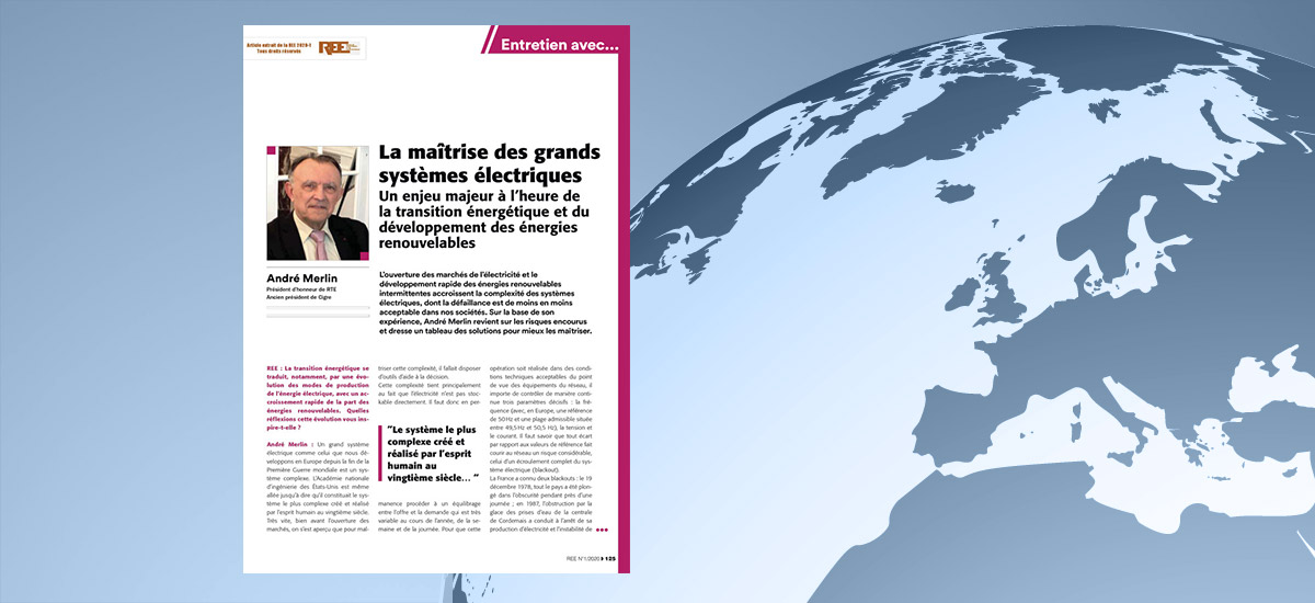 Dans l’entretien ci-après publié dans le numéro 2020-1 de la Revue de l’Électricité et de l’Électronique, André Merlin (président d’honneur de RTE et ancien président du CIGRE(1)) précise les conditions de maîtrise des grands systèmes électriques, dans le contexte de l'ouverture des marchés et du développement rapide des filières renouvelables à production intermittente.