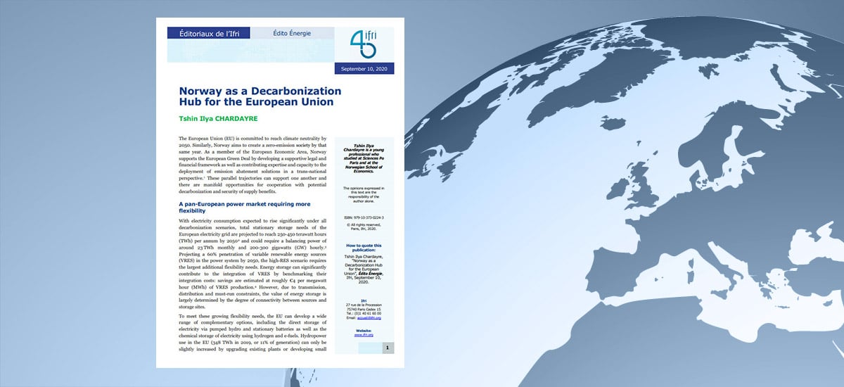 L’Union européenne s’est fixé pour objectif d’atteindre la « neutralité carbone »(1) à l’horizon 2050. Membre de l’Espace économique européen, la Norvège partage cette ambition et peut constituer un « hub pour décarboner l’UE » selon une nouvelle publication du Centre Énergie et Climat de l’Ifri. Dans l’éditorial en anglais ci-après publié le 10 septembre, Tshin Ilya Chardayre explique en effet que la Norvège dispose d’un important potentiel en matière de stockage d’électricité mais aussi de CO2.