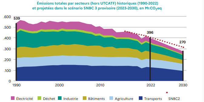 Les plus grosses réductions d'émissions sectorielles d'ici à 2030 par rapport au niveau de 1990 sont attendues dans l'industrie (- 68%) et dans l'énergie (- 65%) mais l'action dans les transports constitue le plus grand défi : comptant pour 32% des émissions françaises de GES, c'est le seul secteur dont les émissions ont augmenté entre 1990 et 2022 (+ 6,5%) et il représente une « complexité absolue » selon les termes d'Agnès Pannier-Runacher, touchant entre autres à la « liberté personnelle » de 67 millions d'acteurs utilisant de nombreux modes de transport, avec une sensibilité accrue sur le sujet (comme en témoigne la crise des « gilets jaunes ») .