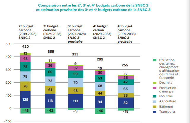 Pour rappel, la SNBC fixe des plafonds d'émissions à ne pas dépasser par périodes de 5 ans (« budgets carbone »), pour 2024-2028, 2029-2033 et 2034-2038.