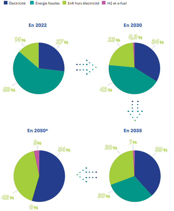 Concrètement, l'ambition est de sortir des énergies fossiles à l'horizon 2050 en s'appuyant sur une production électricité bas carbone : la part de l'électricité dans la consommation finale d'énergie de la France passerait de 27% en 2022 à 34% en 2030, 39% en 2035 et 54% en 2050 (le restant étant fourni par les filières renouvelables hors électricité, l'hydrogène et les carburants synthétiques).