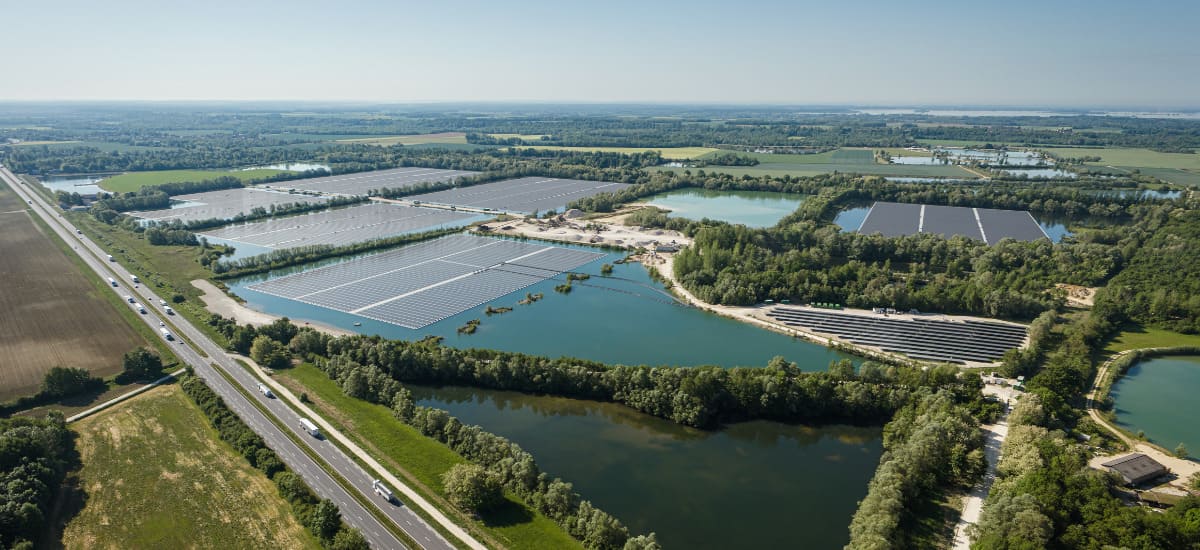 Baptisé « Les Ilots Blandin », le parc flottant comporte plus de 135 000 modules photovoltaïques déployés sur le site d'anciennes gravières sur une surface de 127 hectares, soit l'équivalent de la superficie d'environ 180 terrains de football.