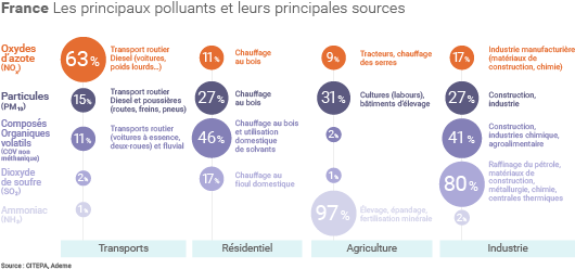 La pollution de l’air est souvent associée au trafic routier, en particulier en zone urbaine où 40% des trajets quotidiens effectués en voiture sont inférieurs à 3 km. Ces déplacements courts émettraient « 2 fois plus de polluants par km qu’un trajet de plus grande distance » (surconsommation du moteur à froid, arrêts et redémarrages fréquents, etc.) selon l’Ademe. L’agence rappelle toutefois également la part prépondérante d’autres sources de polluants à l’image du chauffage dans le secteur résidentiel.