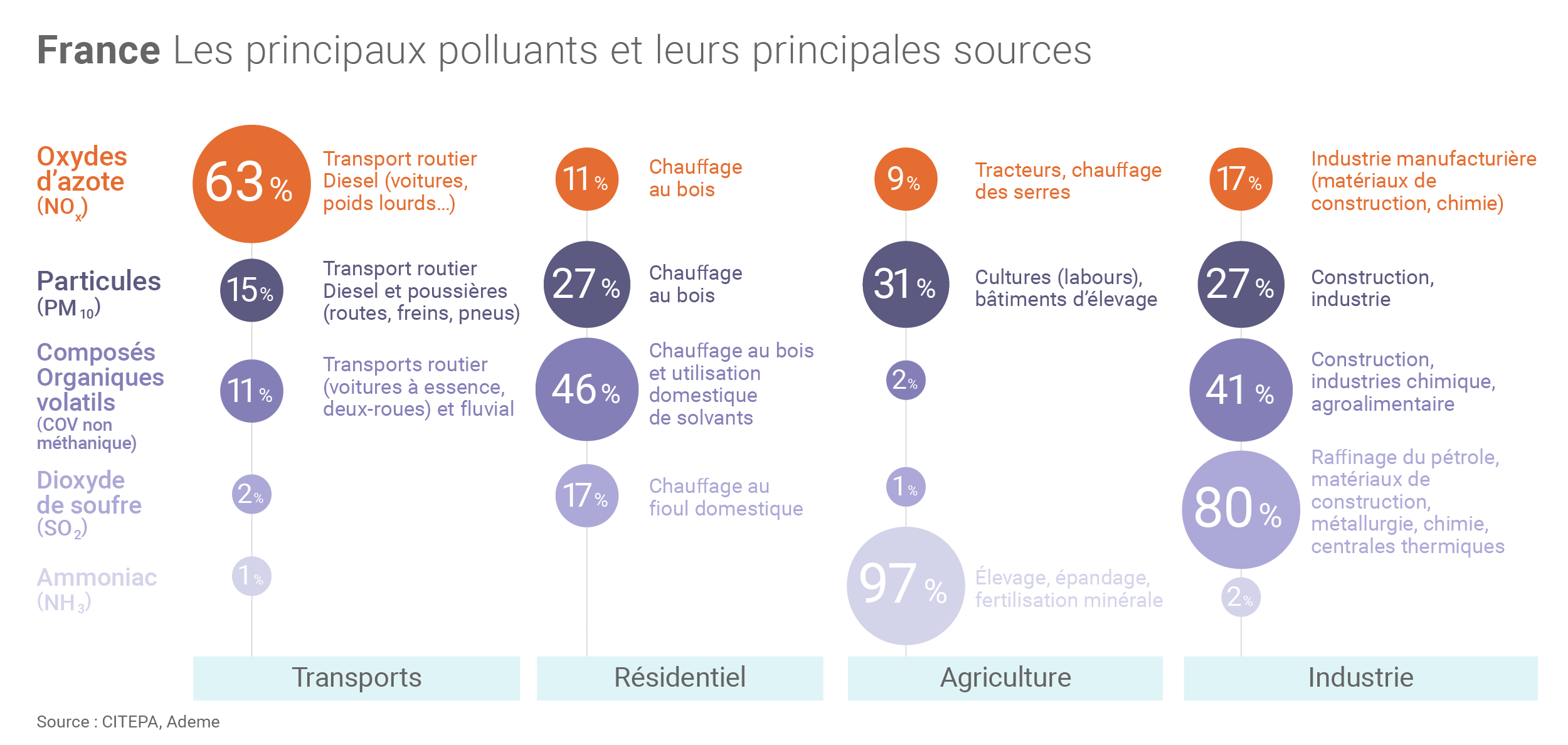 L’Ademe rappelle que la problématique de la pollution de l’air ne concerne pas uniquement les zones urbanisées (où vivent près de 70% des Français), des polluants étant également émis à la campagne (particules, pesticides, etc.) et circulant sur des distances importantes.