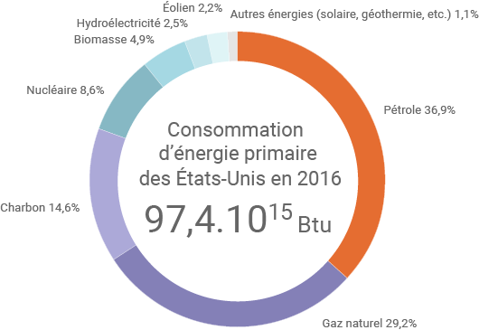 La production américaine d’énergie primaire équivalait à près de 86% des besoins énergétiques du pays en 2016, le reste étant couvert par des importations (pour la grande majorité de pétrole brut)(3). La facture énergétique des États-Unis a atteint près de 60,6 milliards de dollars en 2016(4).