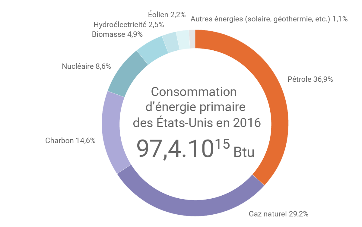Répartition par source de la consommation d’énergie primaire des États-Unis en 2016 (©Connaissance des Énergies, d’après EIA)