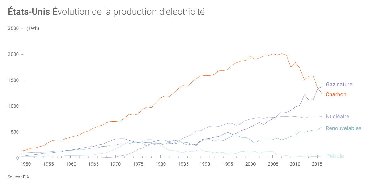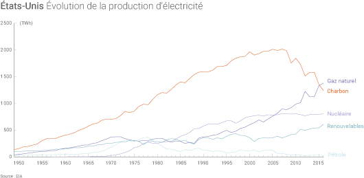 La forte baisse de la consommation de charbon aux États-Unis est liée à l'évolution du mix de production électrique, sa contribution baissant au profit des énergies renouvelables et du gaz naturel. La production électrique éolienne a en particulier augmenté de près de 19% en 2016 (pour atteindre 226,5 TWh). C’est de loin la 2e source d’électricité renouvelable aux États-Unis (5,6% du mix électrique en 2016), juste derrière l’hydroélectricité (6,5% du mix).