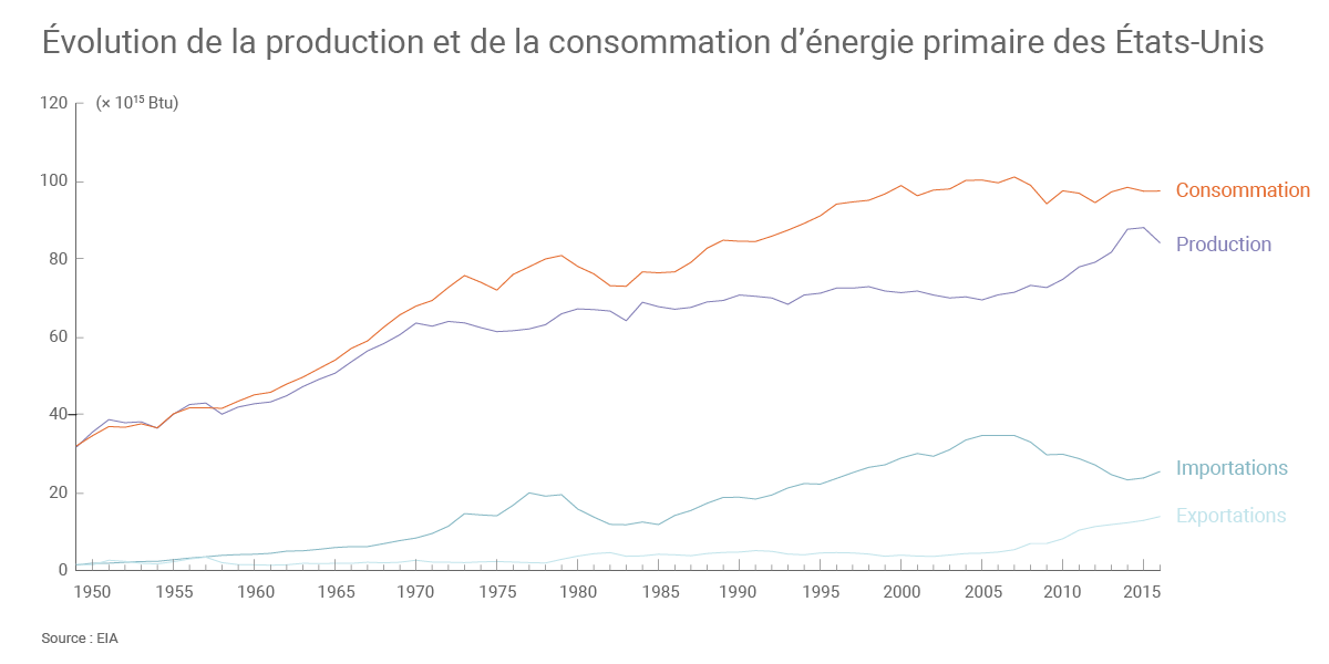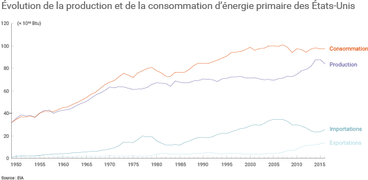 Évolution de la production, de la consommation et des échanges d'énergie des États-Unis depuis 1949 (©Connaissance des Énergies, d’après EIA)