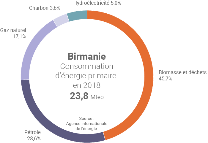 La Birmanie a connu une croissance économique moyenne de 7% par an depuis 2012 mais « il s’agit principalement d’une croissance de rattrapage, faisant suite au long isolement politique et économique du pays entre 1962 et 2011 », indique CCI France International(2). Cette croissance se reflète sur l'évolution de la consommation d’énergie primaire qui a augmenté dans ce pays de plus de 70% entre 2010 et 2018 (pour atteindre 23,8 Mtep cette année-là) selon l’Agence internationale de l’énergie (AIE).