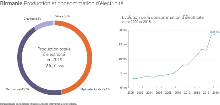 La très grande majorité de la production électrique de la Birmanie repose actuellement sur 2 filières : l’hydroélectricité (47,1% du mix électrique national en 2019) et le gaz naturel (43,7%). Le pays compte « actuellement 20 centrales au gaz et 62 centrales hydroélectriques, ainsi qu'une centrale au charbon », détaille Éric Mottet qui précise qu'avec « l’urbanisation et l’industrialisation du pays, l’énergie hydroélectrique, qui était auparavant la principale source d’énergie domestique » ne pourra pas répondre à la hausse de la demande « malgré un potentiel encore largement inexploité ».