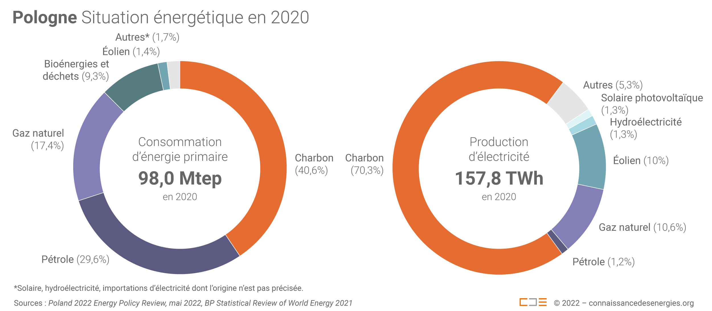 En 2020, les énergies fossiles ont compté pour 88% de la consommation d’énergie primaire de la Pologne(2), dont 40,6% pour le seul charbon. La part du charbon dans la production nationale d’électricité a même avoisiné 80% en 2021 avec le rebond économique post-Covid. La Pologne est ainsi le pays, au sein des 31 membres de l’AIE, où le charbon occupe la place la plus importante dans les mix énergétique et électrique(3). Le pays est par ailleurs le 2e producteur européen de charbon après l’Allemagne et le 10e au niveau mondial.