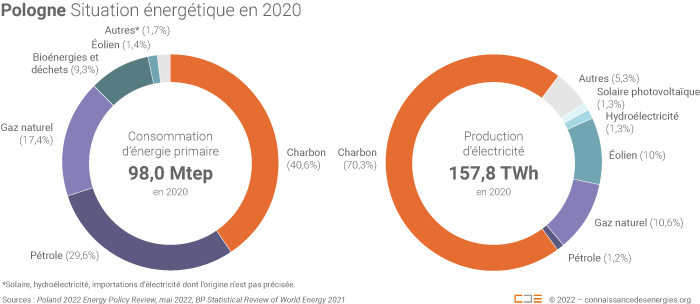 En 2020, les énergies fossiles ont compté pour 88% de la consommation d’énergie primaire de la Pologne(2), dont 40,6% pour le seul charbon. La part du charbon dans la production nationale d’électricité a même avoisiné 80% en 2021 avec le rebond économique post-Covid. La Pologne est ainsi le pays, au sein des 31 membres de l’AIE, où le charbon occupe la place la plus importante dans les mix énergétique et électrique(3). Le pays est par ailleurs le 2e producteur européen de charbon après l’Allemagne et le 10e au niveau mondial.