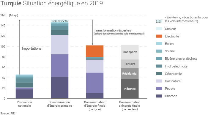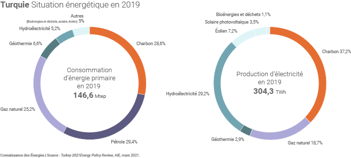 Les énergies fossiles ont encore compté pour 83% la consommation énergétique turque en 2019. L’AIE souligne en outre que la quasi-totalité du pétrole et du gaz consommés en Turquie provient d’importations(4), ce qui explique l'importance pour le pays des recherches de gaz menées en Méditerranée orientale dans un contexte de fortes tensions avec la Grèce et plus globalement l'UE (la Turquie a par ailleurs découvert en mer Noire le champ gazier géant de Sakarya, dont la production est censée commencer en 2023).