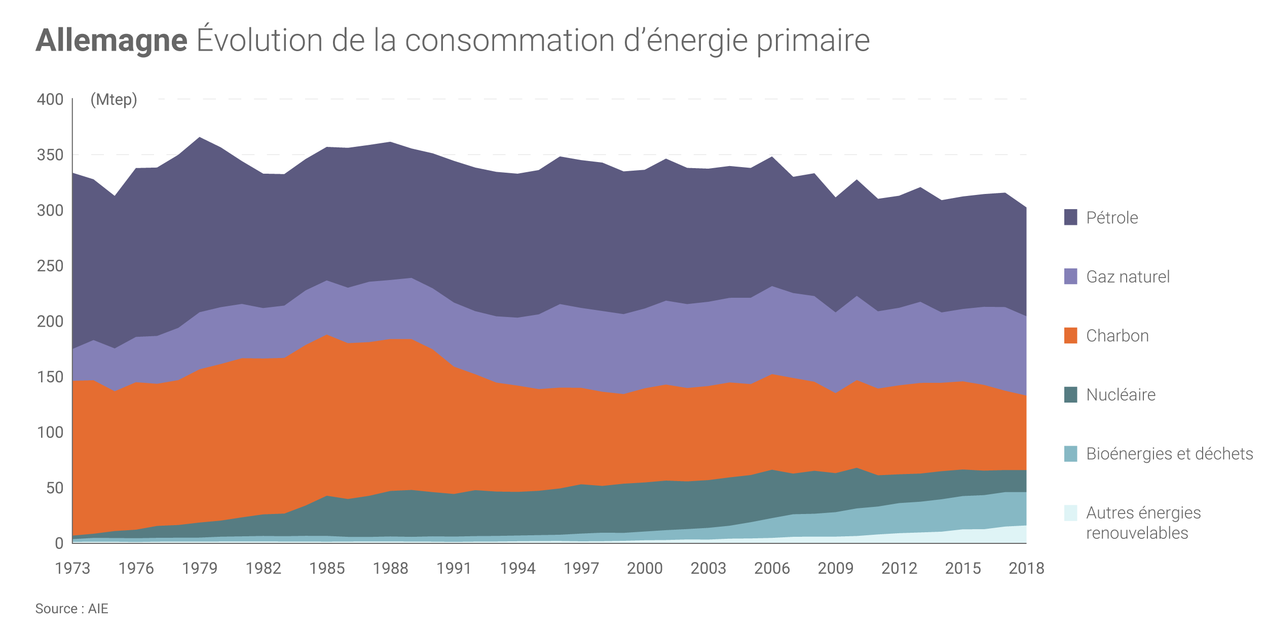 Malgré le développement des filières renouvelables dans le secteur électrique, les énergies fossiles comptent encore pour plus de 79% de la consommation annuelle d’énergie primaire en Allemagne selon les dernières données de l’AIE (portant sur l’année 2018). Rappelons par ailleurs que l’électricité, vecteur qui suscite une attention particulière dans les débats énergétiques, ne compte chaque année que pour près d’un cinquième de la consommation finale d’énergie en Allemagne.