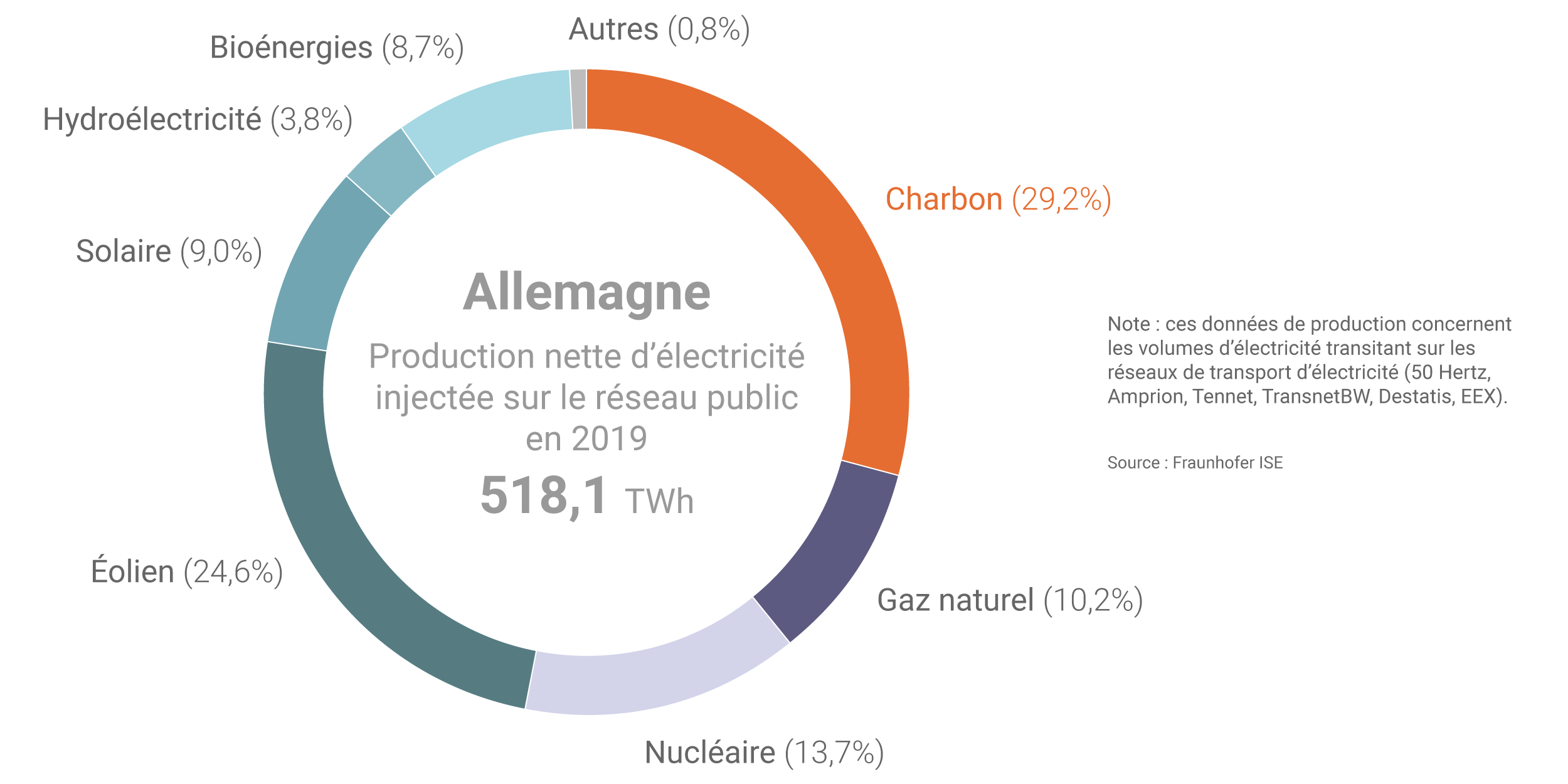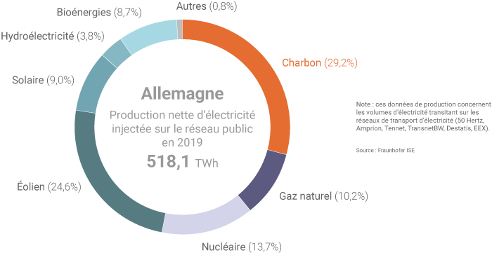 En 2019, l’ensemble des énergies renouvelables a compté pour plus de 46% de l’électricité injectée sur les réseaux en Allemagne (voir infographie ci-après). L’AIE souligne que le déploiement à très grande échelle des filières éolienne et solaire photovoltaïque doit s’accompagner d’un développement important des infrastructures de transport et de distribution d’électricité (notamment entre les parcs éoliens au nord du pays et les zones de consommation dans le sud, ce qui pose des problèmes d’acceptabilité) et d’autres solutions pour faciliter la gestion des réseaux (en ayant notamment recours au vecteur hydrogène).
