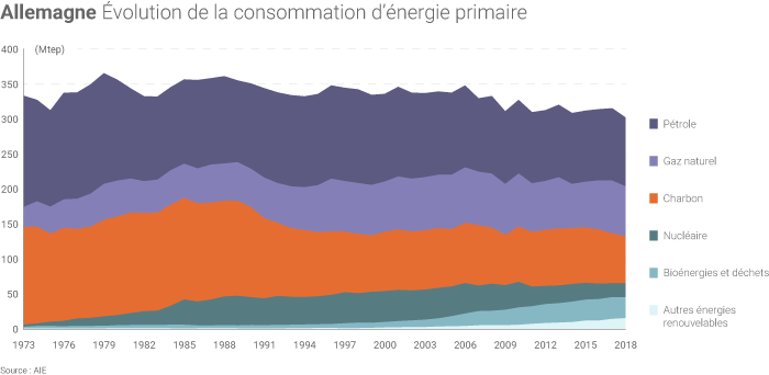 « Au cours des quatre dernières décennies, l’approvisionnement énergétique de l’Allemagne est passé d’une nette domination du charbon et du pétrole à un système plus diversifié », indique l’AIE. Ces deux énergies ont toutefois encore compté pour 56,8% de la consommation d’énergie primaire de l’Allemagne en 2018. (©Connaissance des Énergies, d’après AIE)