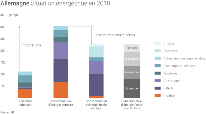 En 2019, l’ensemble des énergies renouvelables a compté pour plus de 46% de l’électricité injectée sur les réseaux en Allemagne (voir infographie ci-après). L’AIE souligne que le déploiement à très grande échelle des filières éolienne et solaire photovoltaïque doit s’accompagner d’un développement important des infrastructures de transport et de distribution d’électricité (notamment entre les parcs éoliens au nord du pays et les zones de consommation dans le sud, ce qui pose des problèmes d’acceptabilité) et d’autres solutions pour faciliter la gestion des réseaux (en ayant notamment recours au vecteur hydrogène).