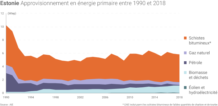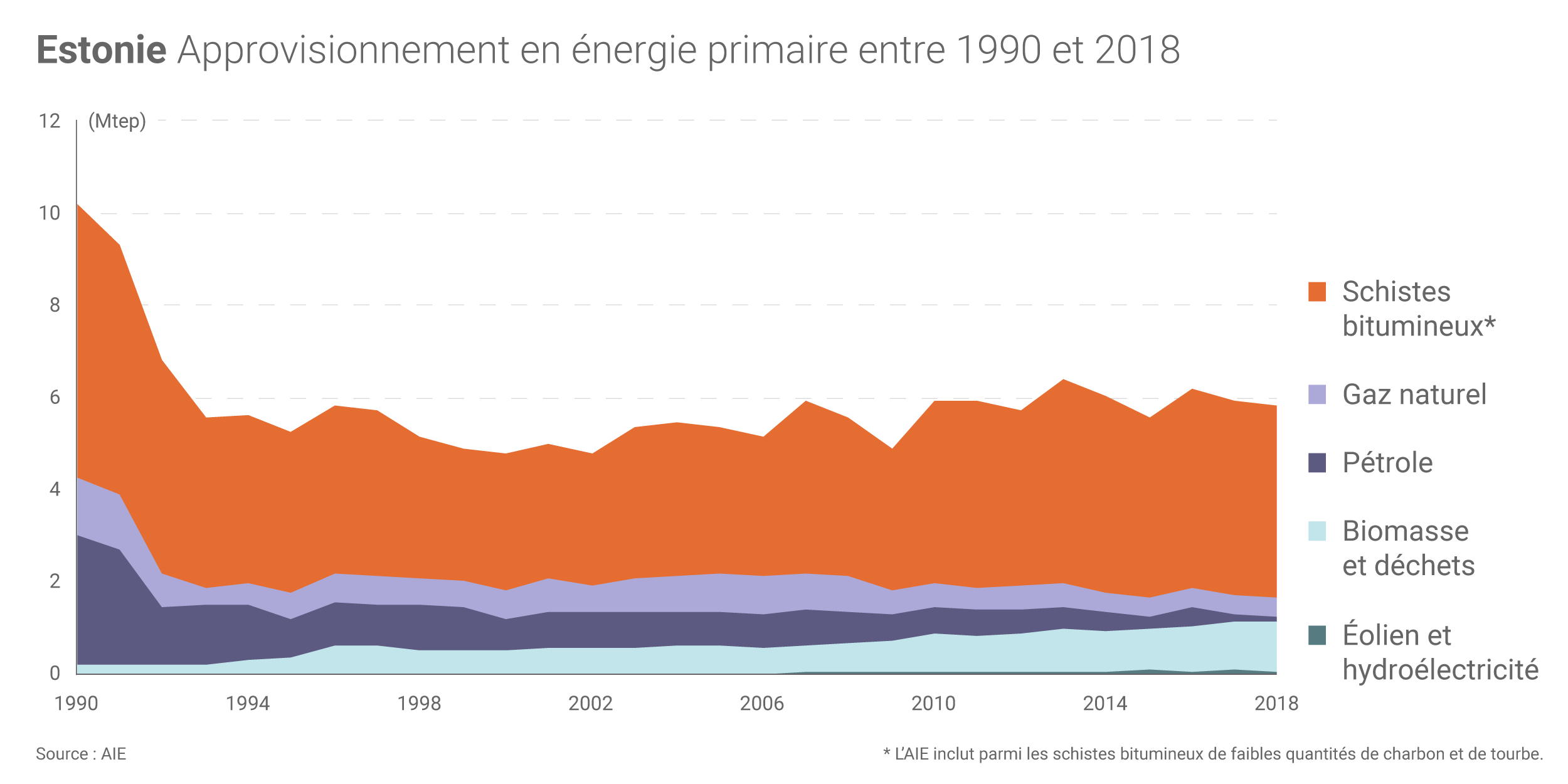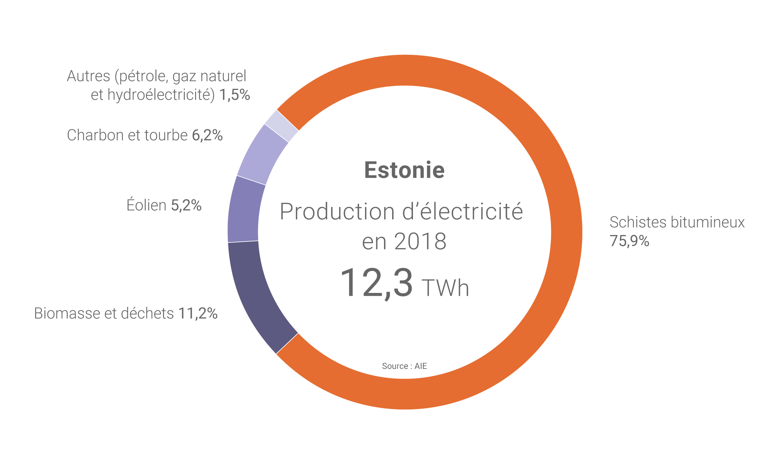 Le système énergétique de l’Estonie se caractérise par une forte dépendance aux schistes bitumineux(3) produits sur son territoire. Ces roches sédimentaires contenant du kérogène sont brûlées pour produire de la chaleur et de l’électricité mais aussi « liquéfiées » pour en extraire les hydrocarbures. En 2018, ces schistes bitumineux ont compté pour 72,7% de l'approvisionnement du pays en énergie primaire et pour 75,9% de la production nationale d’électricité, selon les dernières données de l’AIE.