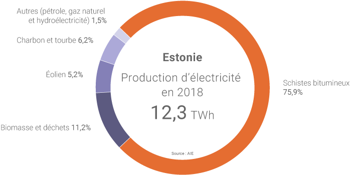Le système énergétique de l’Estonie se caractérise par une forte dépendance aux schistes bitumineux(3) produits sur son territoire. Ces roches sédimentaires contenant du kérogène sont brûlées pour produire de la chaleur et de l’électricité mais aussi « liquéfiées » pour en extraire les hydrocarbures. En 2018, ces schistes bitumineux ont compté pour 72,7% de l'approvisionnement du pays en énergie primaire et pour 75,9% de la production nationale d’électricité, selon les dernières données de l’AIE.