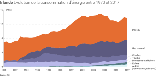 Depuis le dernier rapport de l’AIE consacré à ce pays en 2012, l’Irlande a « réussi à faire progresser la transformation de son secteur énergétique, principalement en matière d’électricité », juge l’Agence internationale de l’énergie. Globalement, l’Irlande reste toutefois très fortement dépendante des énergies fossiles : ces dernières (pétrole, gaz naturel, charbon et tourbe) ont compté pour près de 90% de la consommation d’énergie primaire du pays en 2017 selon les dernières données de l’AIE.