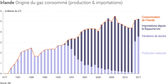 Au cours des dernières années, l’Irlande a renforcé sa sécurité d’approvisionnement, notamment grâce à l'augmentation significative de sa production gazière (suite au début des opérations fin 2015 au sein du champ de Corrib, l’Irlande était à deux tiers « auto-suffisante » en gaz en 2017 selon l’AIE).