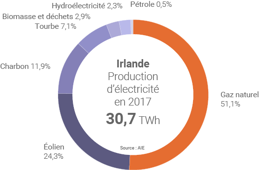 Plus de la moitié de la production irlandaise d'électricité repose sur le gaz naturel mais l’éolien occupe une place croissante dans ce mix (24,3% en 2017). L’AIE indique que le système électrique irlandais peut reposer par moments jusqu’à 65% sur cette source de production intermittente, « sans risque pour la sécurité d’approvisionnement ».